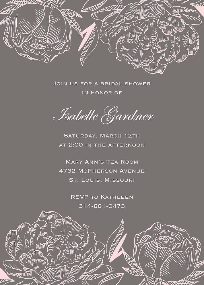 Hand-drawn peonies frame the border of the Linework Peony Bridal Shower Invitation, designed in-house at Paper Source.