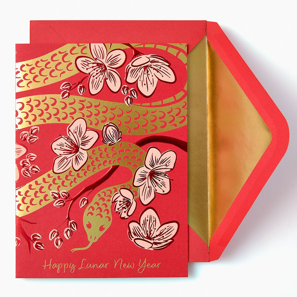 Ring in the Lunar New Year with this festive Year of the Snake Card! Features a beautiful gold foil snake design. Paired with gold foil lined envelope! Designed by Paper Source.