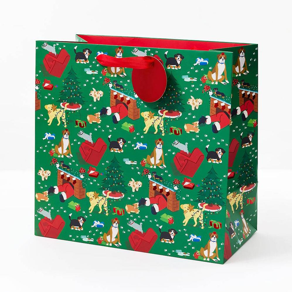 This whimsical bag features adorable illustrations of mischievous pets in festive settings, perfect for capturing the fun and chaos of the season. Size: 13″ x 7″ x 12.5″