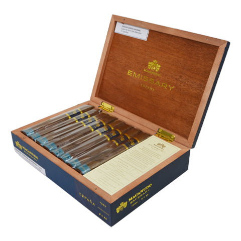 The Macanudo Emissary is a premium cigar that offers a rich experience with flavors reminiscent of almonds, caramel, and cedar. Encased in a USA Connecticut Broadleaf maduro wrapper, it features a Nicaraguan binder and a filler blend of tobaccos sourced from Nicaragua, Colombia, the Dominican Republic, and Spain, all aged for 5 to 10 years.