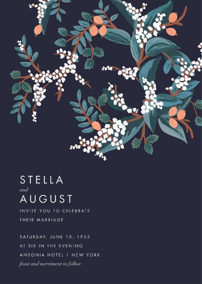 This navy wedding invitation is layered with white font and beautiful florals that will wow your guests. This Rifle Paper Co. for Paperless Post design features a cluster of florals in the top right corner with peachy blooms and leafy greens in cool tones. Printed on superfine white paper, which has a smooth finish and is soft to the touch. 130# cover weight paper with 30% post consumer recycled content.