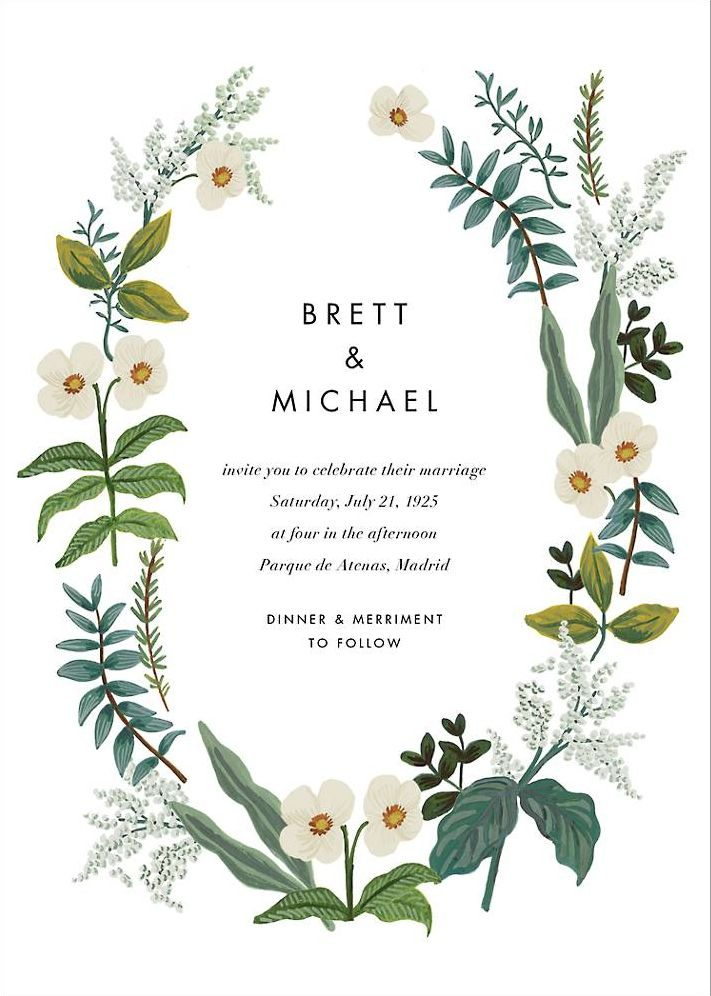 The Meadow Garland Wedding Invitation features a wreath of green leaves and white flowers encircling your text—a lovely design from Rifle Paper Co. for Paperless Post. Printed on Mohawk superfine white 130 lb. card stock that is soft to the touch and matches our superfine white envelopes. Paper is FSC certified and made using wind power. Corresponding Paperless Post digital design also available.