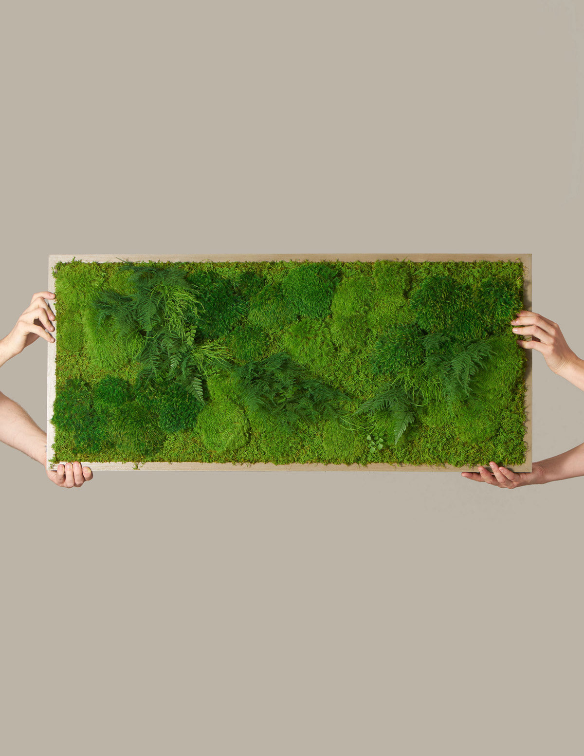 This zero maintenance large ‘living wall’ will liven-up any interior space. A combination of moss and ferns preserved in their prime, there is no upkeep necessary – simply hang and enjoy. These are real plants that have been naturally preserved. Each piece is handcrafted and unique – natural variations will occur. There might be a slight odor upon unpacking your living wall, but it will subside in about 3 weeks. Keep it out of direct light and never water.