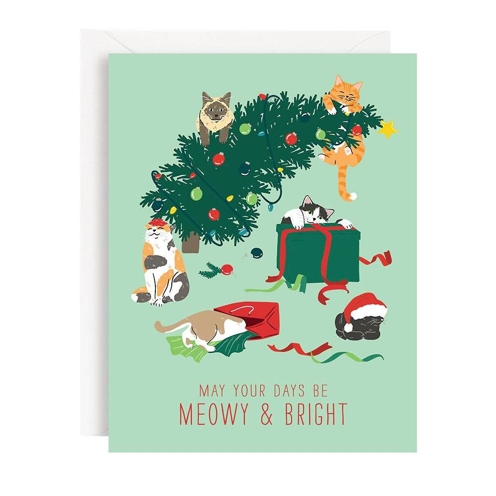 These mischief cats are ready to turn the holidays upside down! Send this punny card wishing “May your holidays be meowy & bright!” Blank inside. Paired with white envelope. Designed by Paper Source.