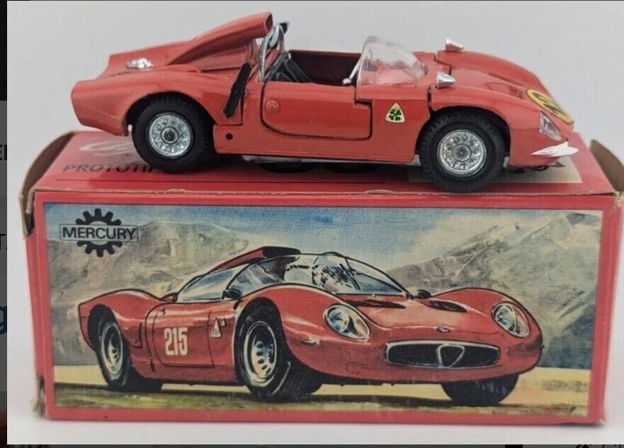 This is a rare Mercury Toys #64 Alfa Romeo 33 Prototipo diecast car made in Italy at a 1:43 scale. The car comes in its original box and has never been opened. The brand is well-known for its high-quality diecast cars, and this Alfa Romeo is no exception.