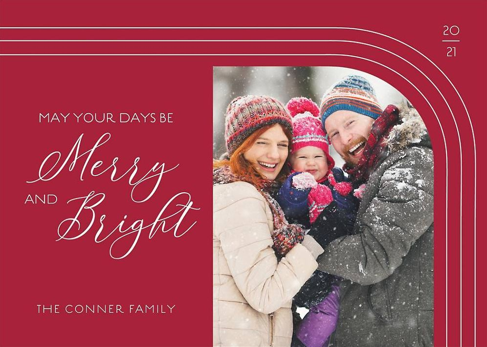 Let holiday tidings ring from home to home with this tasteful holiday photo card. Send a warm and loving message to friends and family with one of our unique custom holiday cards, featuring artwork created by our designers in Chicago. Printed on Mohawk ultra white 120 lb. card stock that is soft to the touch and matches our superfine white envelopes. Paper is FSC certified and made using wind power.