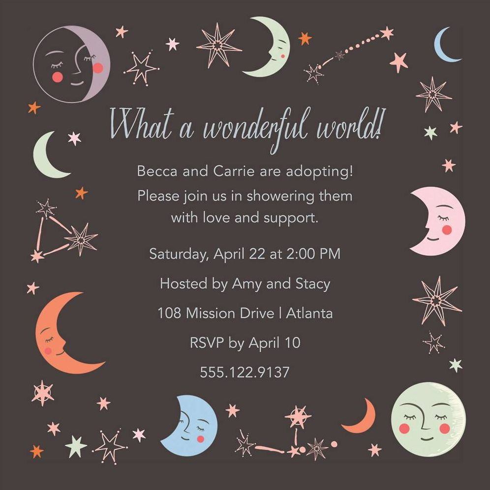 Gather all the stars in your orbit to shower the parents-to-be with all they’ll need for their growing family. Printed on Mohawk superfine white 130 lb. card stock that is soft to the touch and matches our superfine white envelopes. This paper is FSC certified, with 30% post-consumer recycled content, and made using wind power.