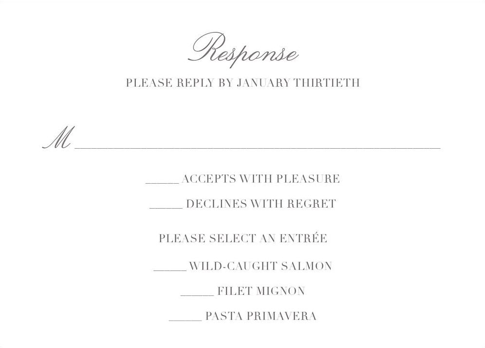 This simple RSVP card complements the other pieces in this suite of wedding cards designed by Felix Doolittle for Paperless Post. Printed on Mohawk superfine white 130 lb. card stock that is soft to the touch and matches our superfine white envelopes. Paper is FSC certified and made using wind power.