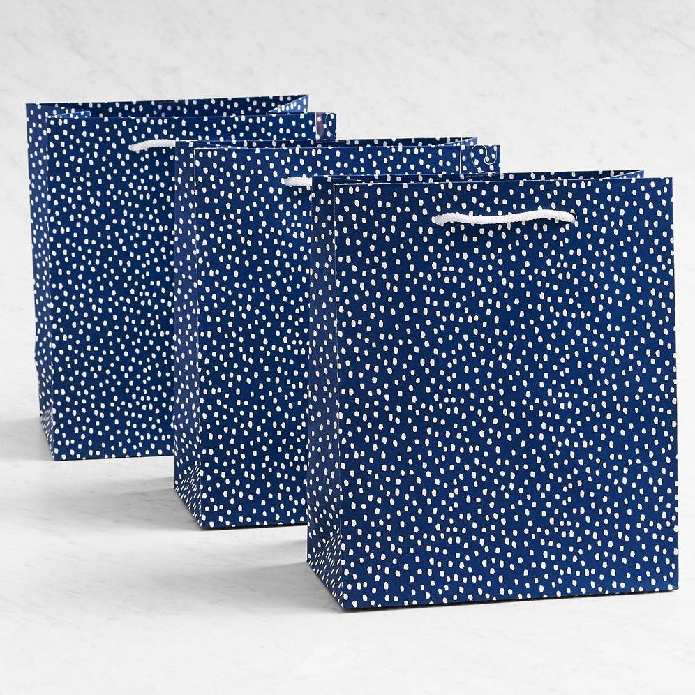 Make sure your thoughtful gift is beautifully wrapped by choosing a stylish gift bag. Navy bag features a fun white polka-dot design. Embellish with ribbons and bows and you have a stunning gift. Includes a sturdy white cord handle.