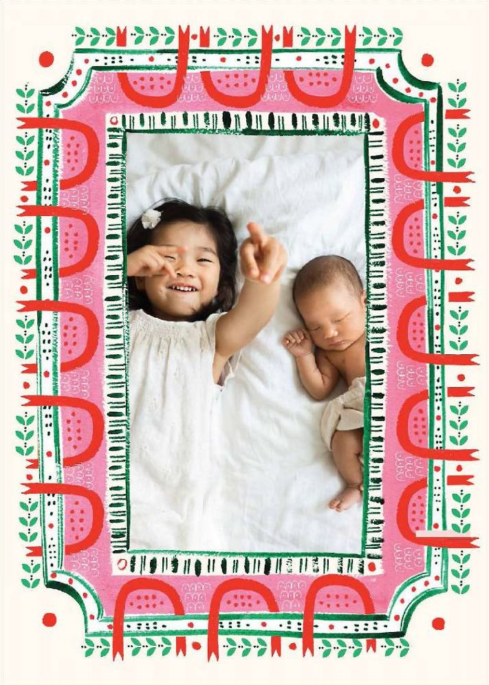 This bright and eclectic card from Mr. Boddington’s studio features a holiday frame in folk-inspired hand-drawn elements. Printed on Mohawk 120.0 lb Superfine Ultra White. This paper is FSC certified, with 30% post consumer recycled content, and made using wind power. Looking for something speedier than snail mail? You can send this design digitally with our partners at Paperless Post.