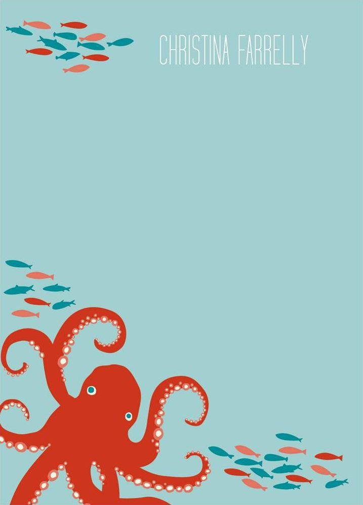 Our magical persimmon octopus swimming amidst schools of colorful fish, is a nautical wonder on this refreshing pool personalized stationery. Printed on superfine white paper, which has a smooth finish and is soft to the touch. 130# cover weight paper with 30% post consumer recycled content.