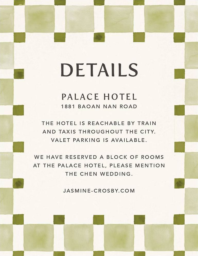 Pair these information cards with your “Organic Check†invitation suite from Paperless Post, or mix and match to your style from any suite in our wedding collection. Printed on Mohawk superfine white 130 lb. card stock that is soft to the touch and matches our superfine white envelopes. This paper is FSC certified, with 30% post-consumer recycled content, and made using wind power. Running low on time? You can send this design digitally with our partners at Paperless Post.