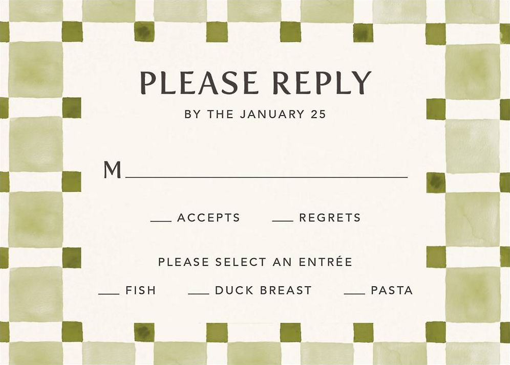 Pair these response cards with your “Organic Check” invitation suite from Paperless Post, or mix and match to your style from any suite in our wedding collection. Printed on Mohawk superfine white 130 lb. card stock that is soft to the touch and matches our superfine white envelopes. This paper is FSC certified, with 30% post-consumer recycled content, and made using wind power. Running low on time? You can send this design digitally with our partners at Paperless Post.