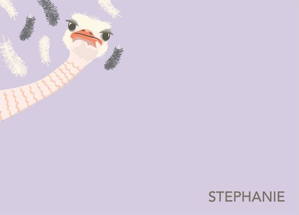 Our fantastic ostrich peeks his head around to say hello in this whimsical stationery design. Pretty plum background keeps things cheerful! Printed on superfine white paper, which has a smooth finish and is soft to the touch. 130# cover weight paper with 30% post consumer recycled content.
