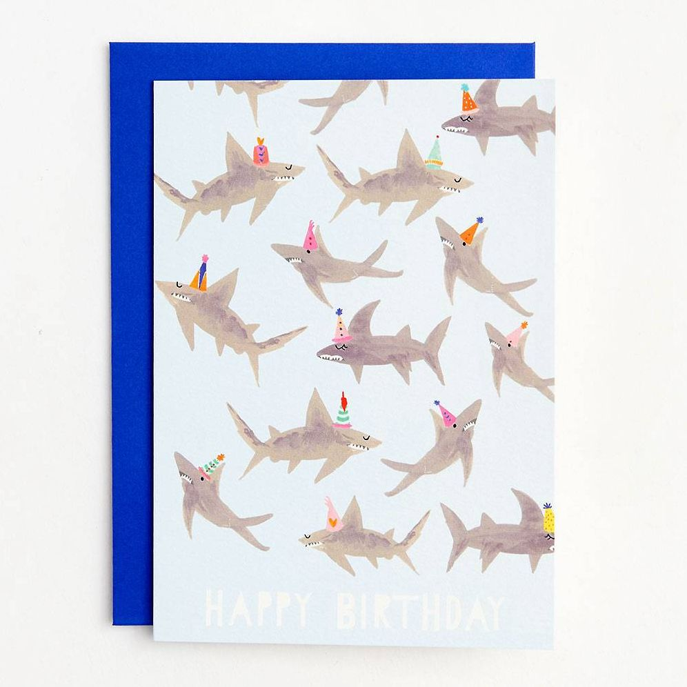 These sharks are ready to sink their teeth into some birthday cake! Illustration features sharks dancing in party hats and reads ‚ÄúHappy Birthday‚Äù in white text. Folded card. Blank inside. Accompanied by royal blue envelope. By Mr. Boddington’s Studio.