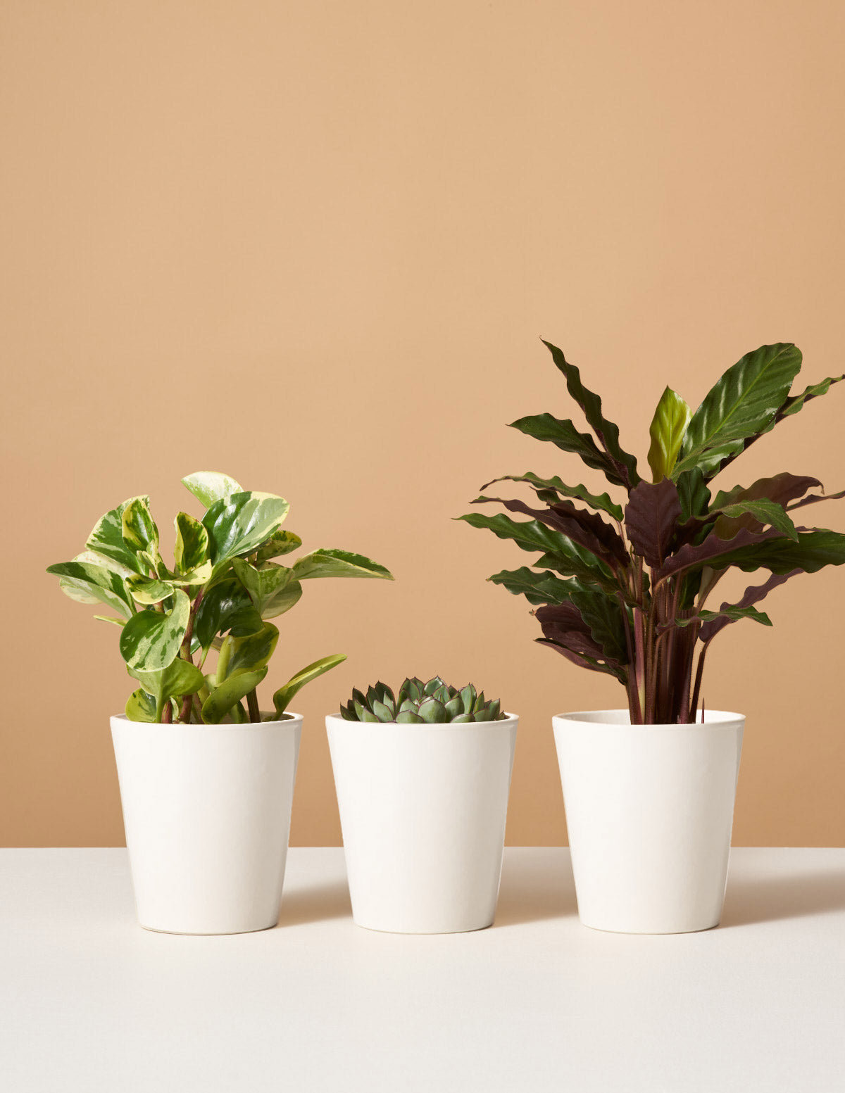 - Sizing: small plants in 4” diameter grow pots nestled inside 5” diameter ceramic planters