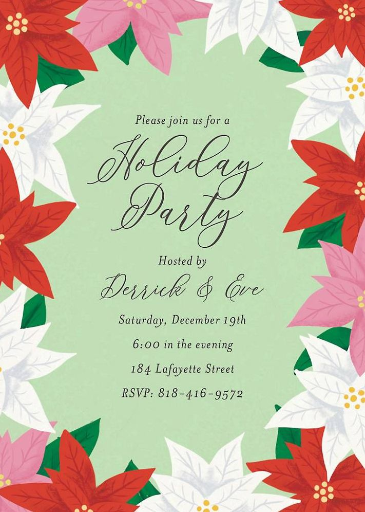Lovely and colorful poinsettias border your choice of a light or dark background on this customizable party invitation from the designers at Paper Source. Printed on Mohawk ultra white 120 lb. card stock that is soft to the touch and matches our superfine white envelopes. Paper is FSC certified and made using wind power.