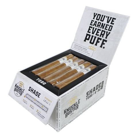 The Punch Knuckle Buster Shade is a smooth, medium-bodied cigar offering a mellow experience with earthy, nutty, and toasty flavors. It boasts a warm brown Ecuadorian Connecticut Shade wrapper encasing a blend of Mexican binder and filler composed of Dominican Olor, USA Broadleaf, Colombian, and Nicaraguan tobaccos.