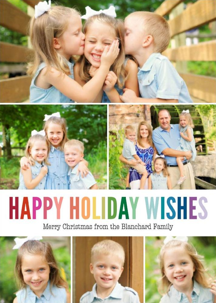 The vibrant array of colors in this bold font is the perfect compliment to your holiday photos. And with this design, you don’t have to choose just one! Printed on Mohawk ultra white 120 lb. card stock that is soft to the touch and matches our superfine white envelopes. Paper is FSC certified and made using wind power.