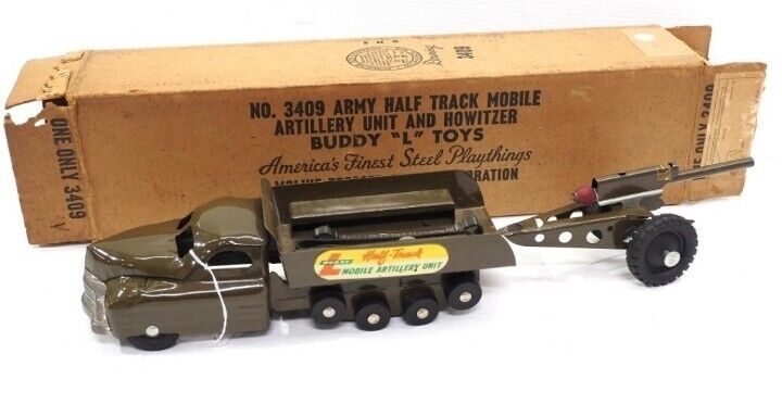 For collectors of vintage military toys, this Buddy L 409 Half Track Mobile Artillery Unit is a rare find. The 1940s 50s toy truck comes complete with a cannon and original box. The pressed steel construction and green color give it an authentic military look. This Buddy L toy truck is a must-have for any serious collector of vintage military toys. Buddy L No.3409 Army Half Track Mobile Artillery Unit and Howitzer, with original box and rubber tracks -one track broken, otherwise very good, box is fair.