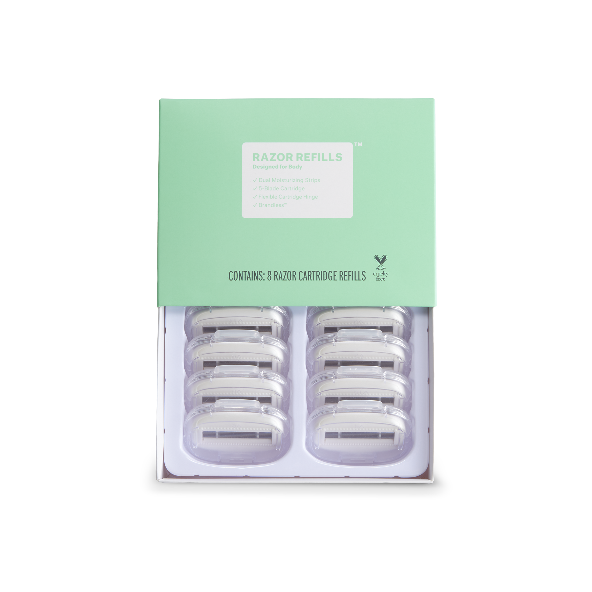 Our 8 pack of razor cartridge refills keep your Brandless shaving kit sharp, handy & useful. Blades with rounded edges to follow your contours. Dual moisturizing strips with aloe vera & vitamin E strips soften.