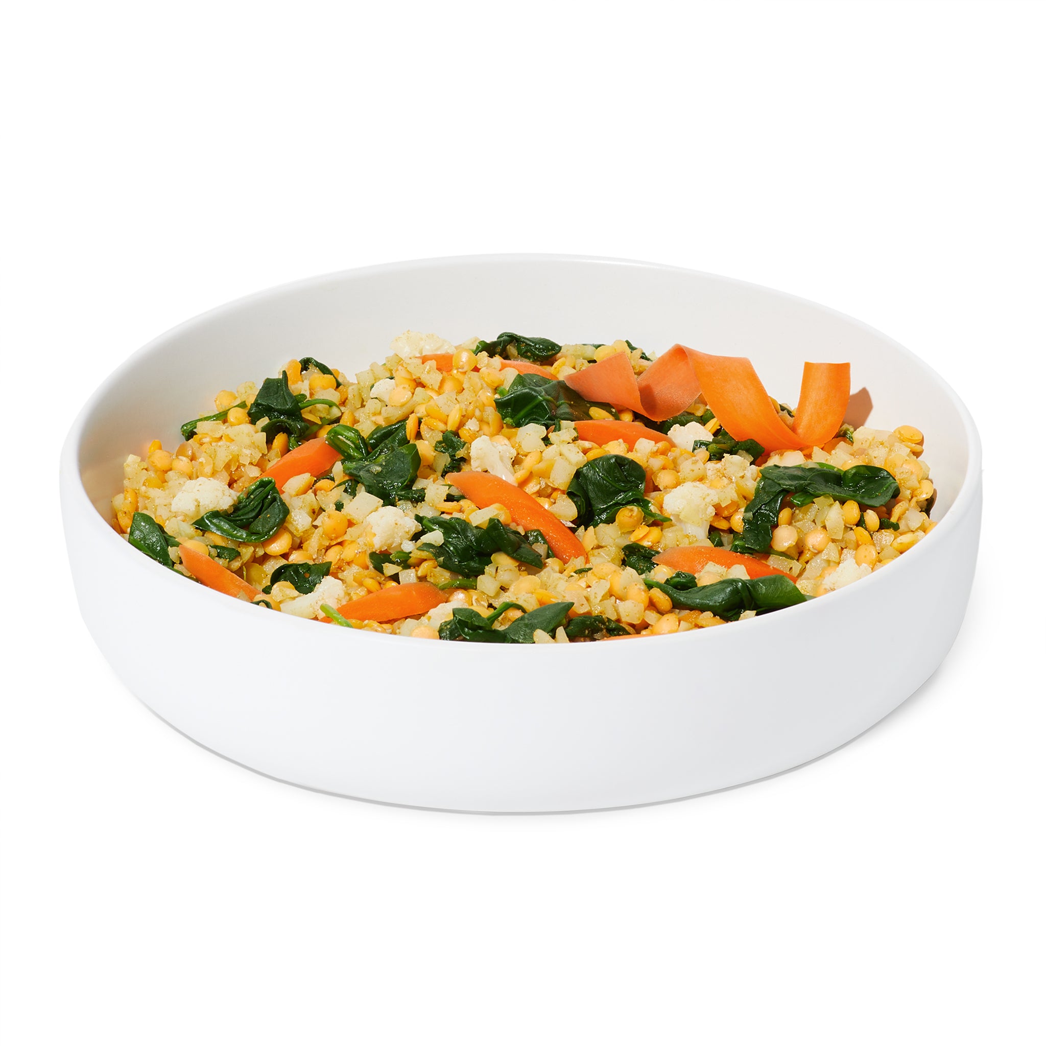 We love kitchari, an Ayurvedic dish. Like the original, ours is spiced with ginger, garlic, cilantro, and turmeric, all balanced by creamy coconut. We stuck with traditional lentils (a source of protein), swapped basmati rice with cauliflower, then added spinach and carrots because we just love vegetables that much.