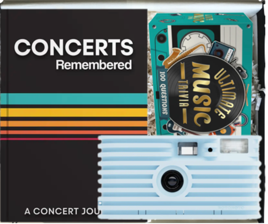 Unwrap your ultimate concert experience with this gift box! Inside, you’ll find a concert journal to capture your memories, a music trivia game to test your knowledge, and a disposable camera to snap moments that’ll last a lifetime. CONCERTS REMEMBERED: A CONCERT JOURNAL ULTIMATE MUSIC TRIVIA CARD GAME FOTOFOTO // SUSTAINABLE DISPOSABLE CAMERA