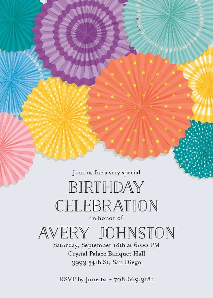 Our famous paper rosettes make a colorful decoration for this birthday party invitation!
