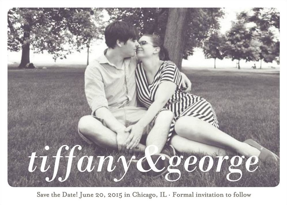 A sweet rounded corner frame and playful typography create a delightful design for your photo save the date. Printed on white 130 lb cover paper with a tactile vellum finish. 100% post-consumer waste, FSC certified.