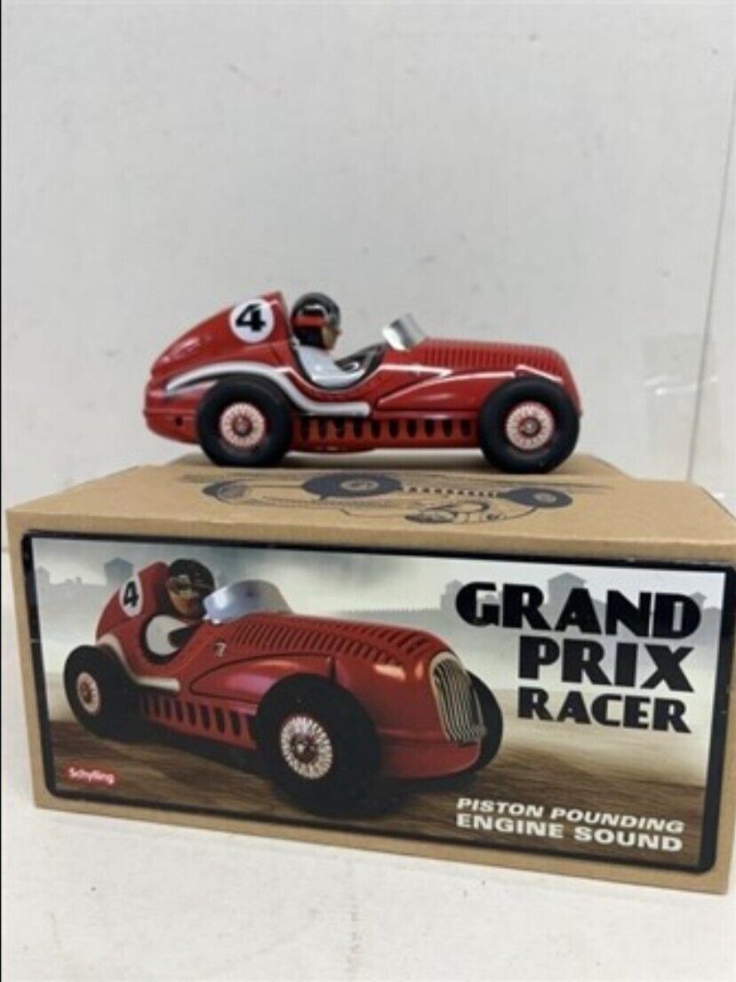 This Schylling Grand Prix Racer is a vintage racing car toy from 2012 that comes in its original box. It features a unique piston pounding noise and friction engine that adds to the excitement of playing with it. The brand, Schylling, is known for producing high-quality vintage toys, and this one is no exception.