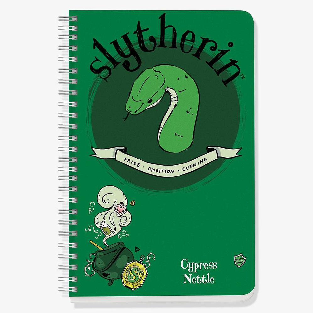 Hone your ambition in the pages of this notebook featuring the Slytherin serpent in dashing green and silver. Our notebooks feature a thick matte cover and 60 sheets of bright white 70# text weight paper in the style of your choice: blank, lined, or date book. While a suitable vessel for cataloging secrets, please note that additional enchantments will be needed to guard these pages against spellcraft such as revelio or aparecium. Designed by Con*Quest Journals.