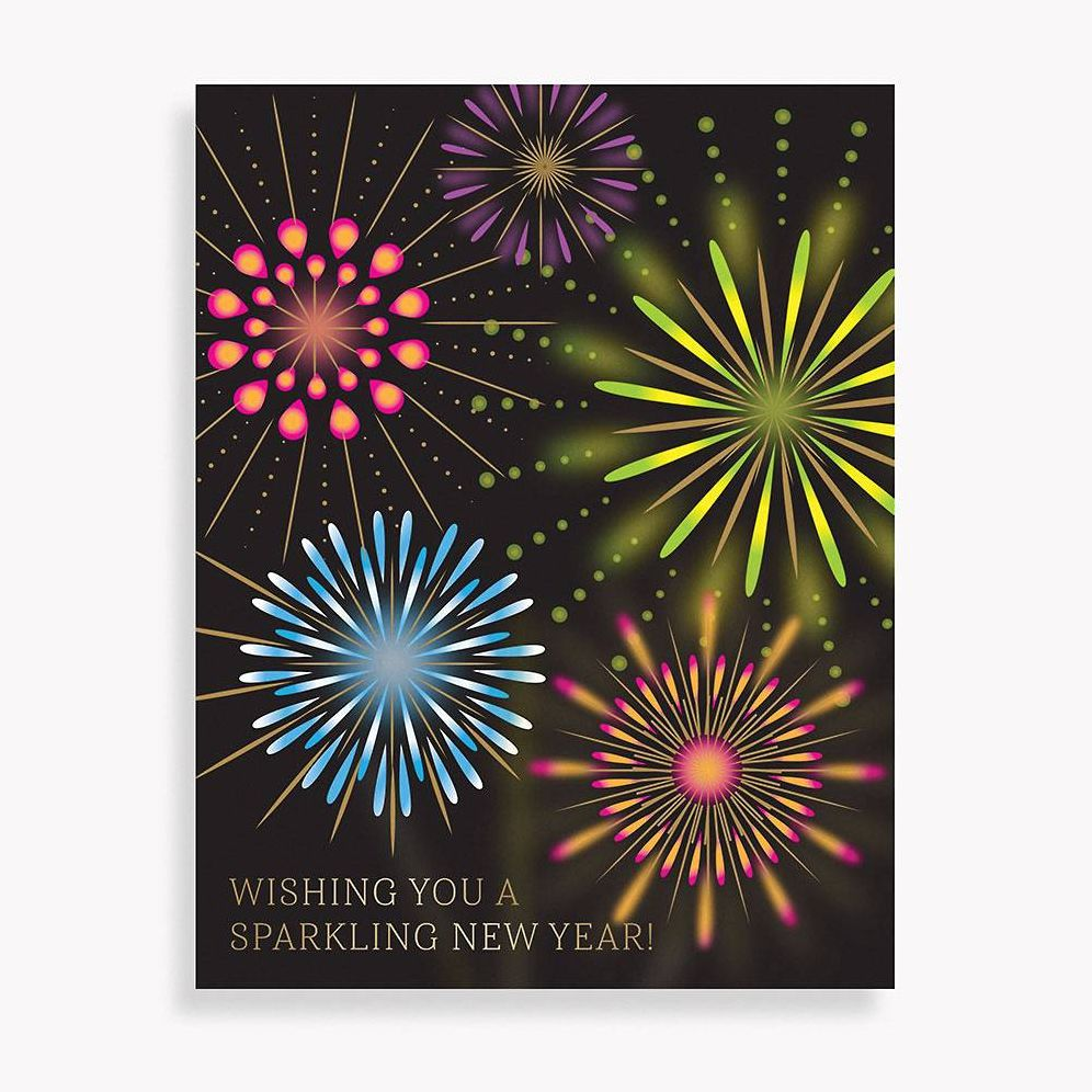 Send some fireworks to celebrate the new year! This colorful card features gold foil details and lettering that reads, “Wishing You a Sparkling New Year!”