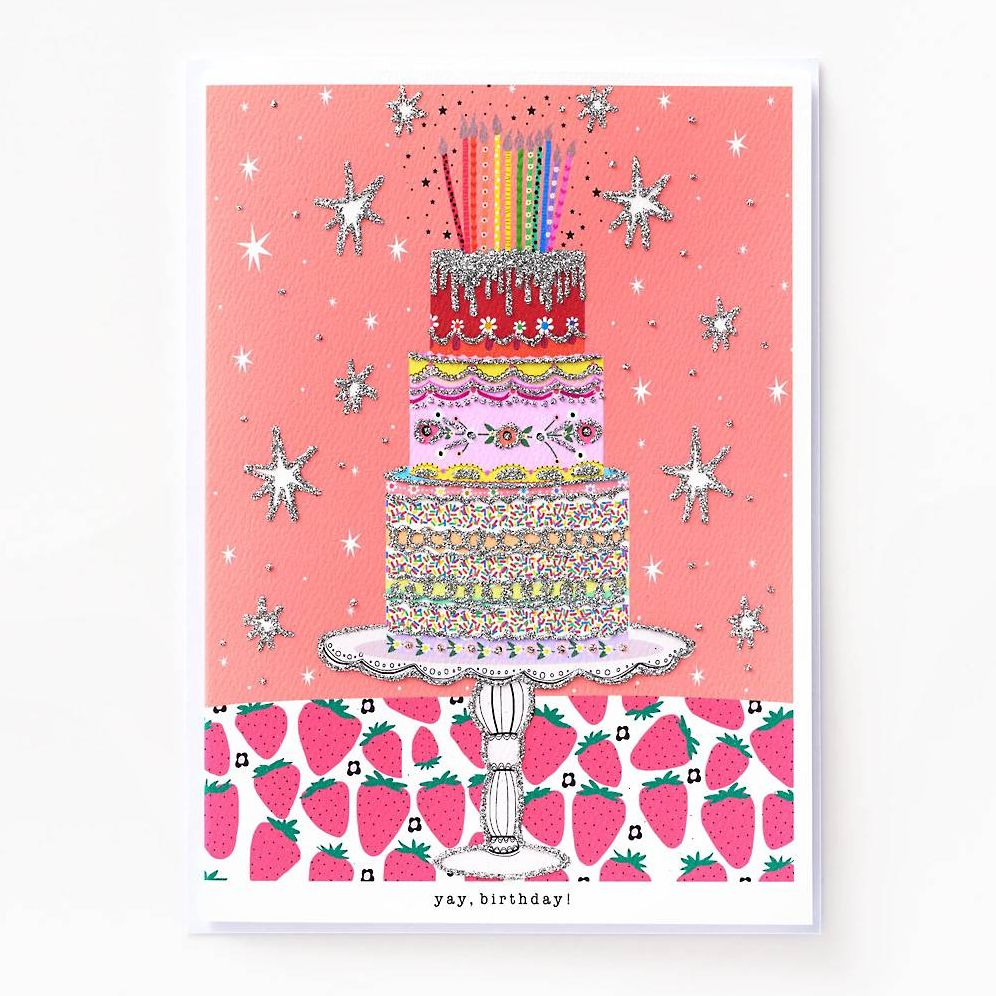 Yay! Send this festive card to celebrate a birthday. Features silver glitter and painted details. Folded card Blank inside Paired with matching envelope By Verrier