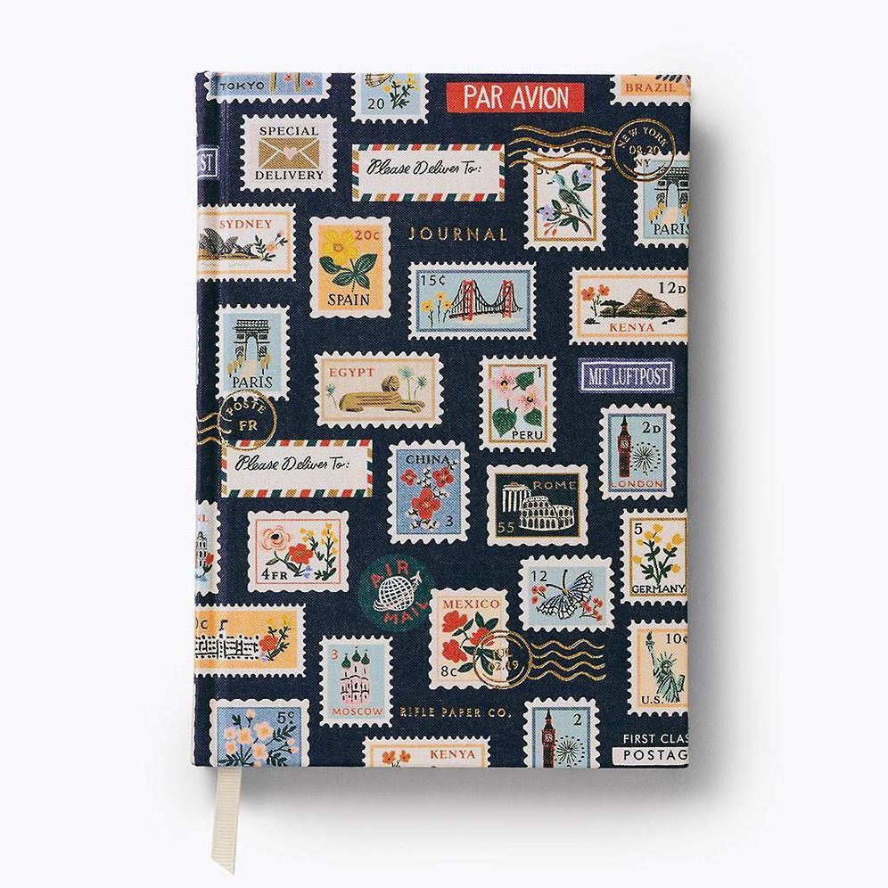 Let the Postage Stamps Fabric Journal inspire your next adventure with each turn of the page. It features a hard cover wrapped in printed book cloth, lay-flat binding, a coordinating bookmark, and gold foil accents. By Rifle Paper Co.