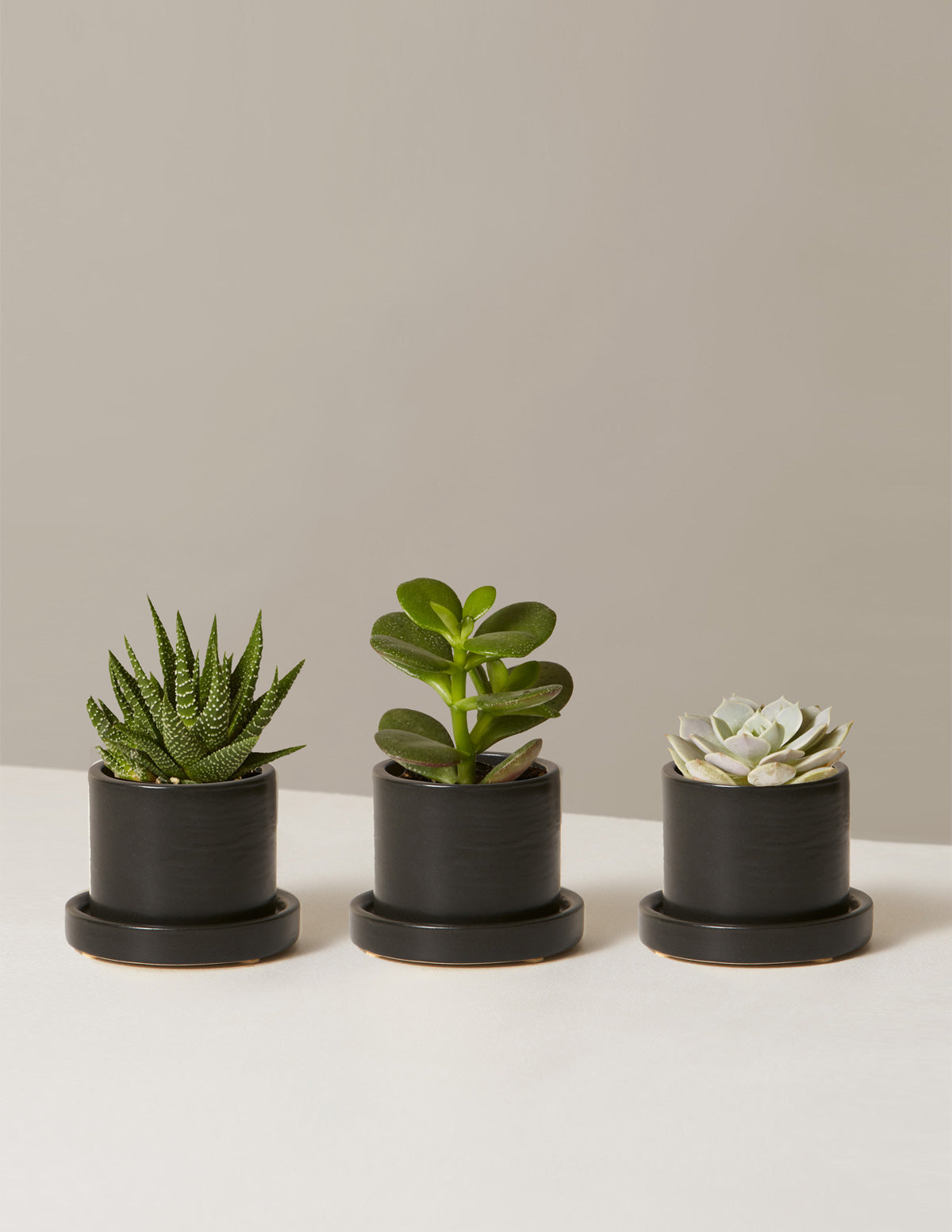 This exclusive set is perfect for a small windowsill or sunny space, and hard to kill. You’ll get a variety of miniature succulents with matching planters to display them in. Miniature succulents arrive in grow pots or nestled in your planter choice We will do our best to match your assortment to what is pictured