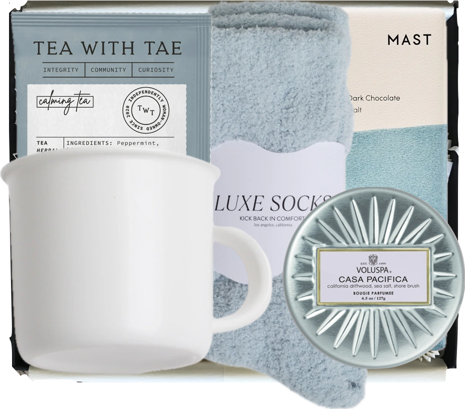 Take a break and treat yourself to some much deserved R&R with these cozy essentials. BOXFOX CLOUD CERAMIC MUG MAST CHOCOLATE BAR VOLUSPA CASA PACIFICA MINI TIN CANDLE BOXFOX LIGHT BLUE LUXE SOCKS TEA WITH TAE SINGLE SACHET- CALMING TEA KEEPSAKE BOX