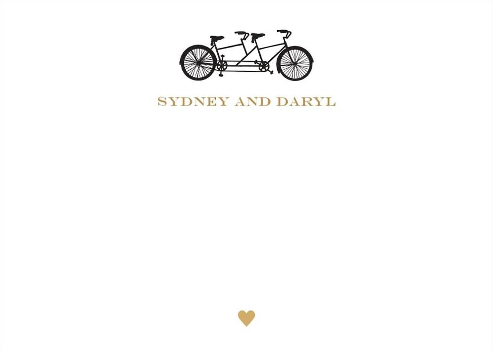 Announce the start of the rest of your life with your significant other or send a thanks after the fact with this wedding stationery by kate spade new york for Paperless Post. The tandem bicycle icon is top and center with a place underneath to add whichever kind of message you choose. Printed on Mohawk superfine white 100 lb. card stock that is soft to the touch and matches our superfine white envelopes. Paper is FSC certified and made using wind power.