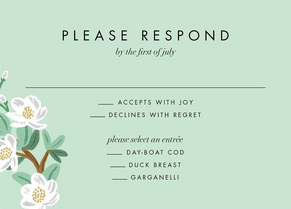 Give your guests something to look forward to with these elegant response cards by Rifle Paper Co. for Paperless Post Featuring floral illustrations and a place to add details to keep your guests informed. Printed on Mohawk superfine white 100 lb. card stock that is soft to the touch and matches our superfine white envelopes. Paper is FSC certified and made using wind power.