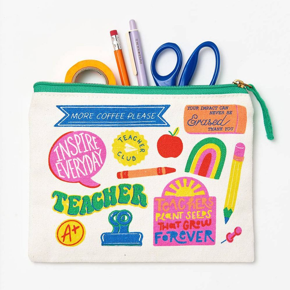 This gorgeous pouch is made from 100% cotton canvas, and has been screen printed using water based inks for that color POP! The fun design makes it the perfect gift for your favourite teacher and can be reused for years to come!