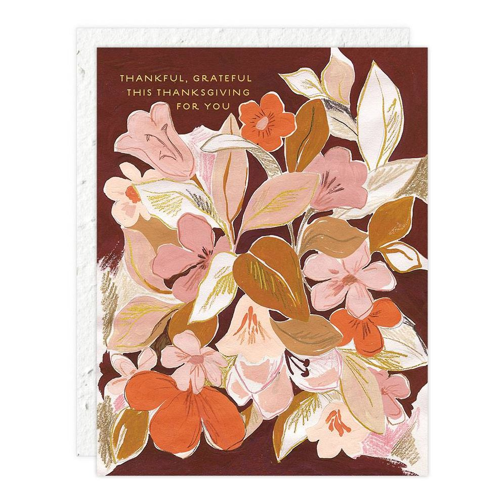 Have your paper and plant it too, with this Thanksgiving greeting card by Seedlings. Hot foil stamped by hand in small batches in Massachusetts, this card is printed on premium paper and is paired with a 100% plantable seed paper envelope. Embedded with non-invasive wildflower seeds, this envelope composts away when planted, leaving only flowers behind. You’re gonna dig it. Front reads, “Thankful, Grateful this Thanksgiving for you.” Blank inside. Artwork by Emily Kopcik.
