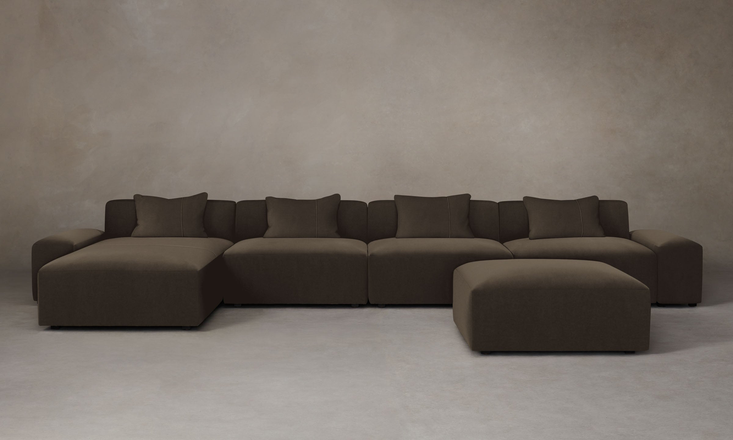 The Breuer modular sectional draws inspiration from the bold and graphic shapes of brutalist design. Tightly upholstered for a sleek look, it has a low-lying seat accompanied by plush throw pillows.