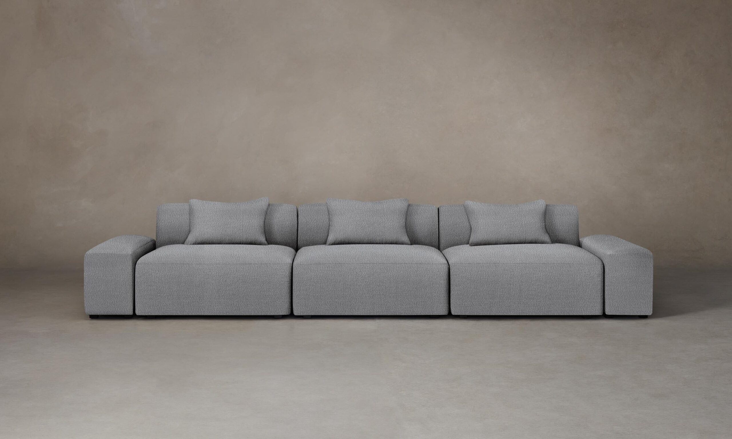 The Breuer modular sofa draws inspiration from the bold and graphic shapes of brutalist design. Tightly upholstered for a sleek look, it has a low-lying seat accompanied by plush throw pillows.
