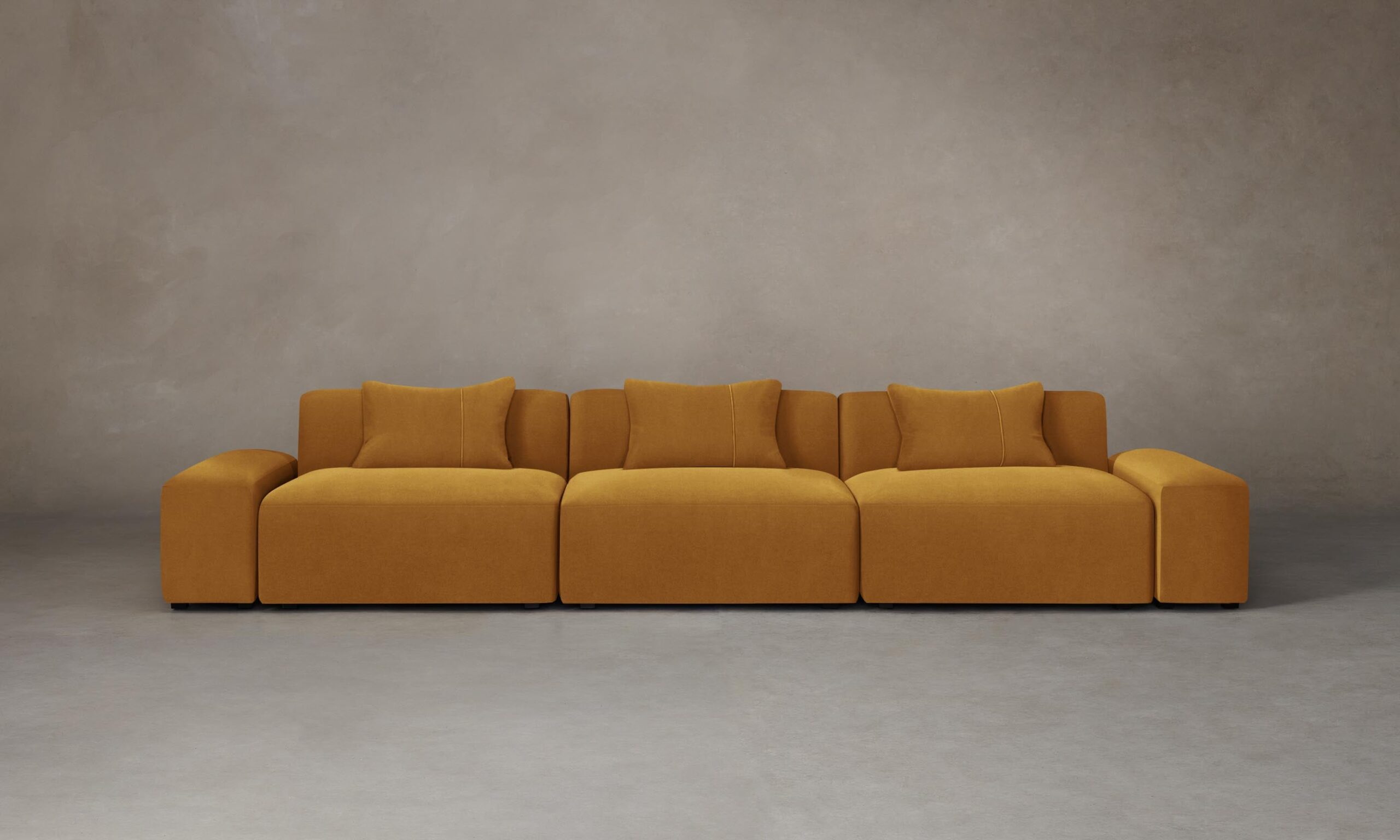 The Breuer modular sofa draws inspiration from the bold and graphic shapes of brutalist design. Tightly upholstered for a sleek look, it has a low-lying seat accompanied by plush throw pillows.