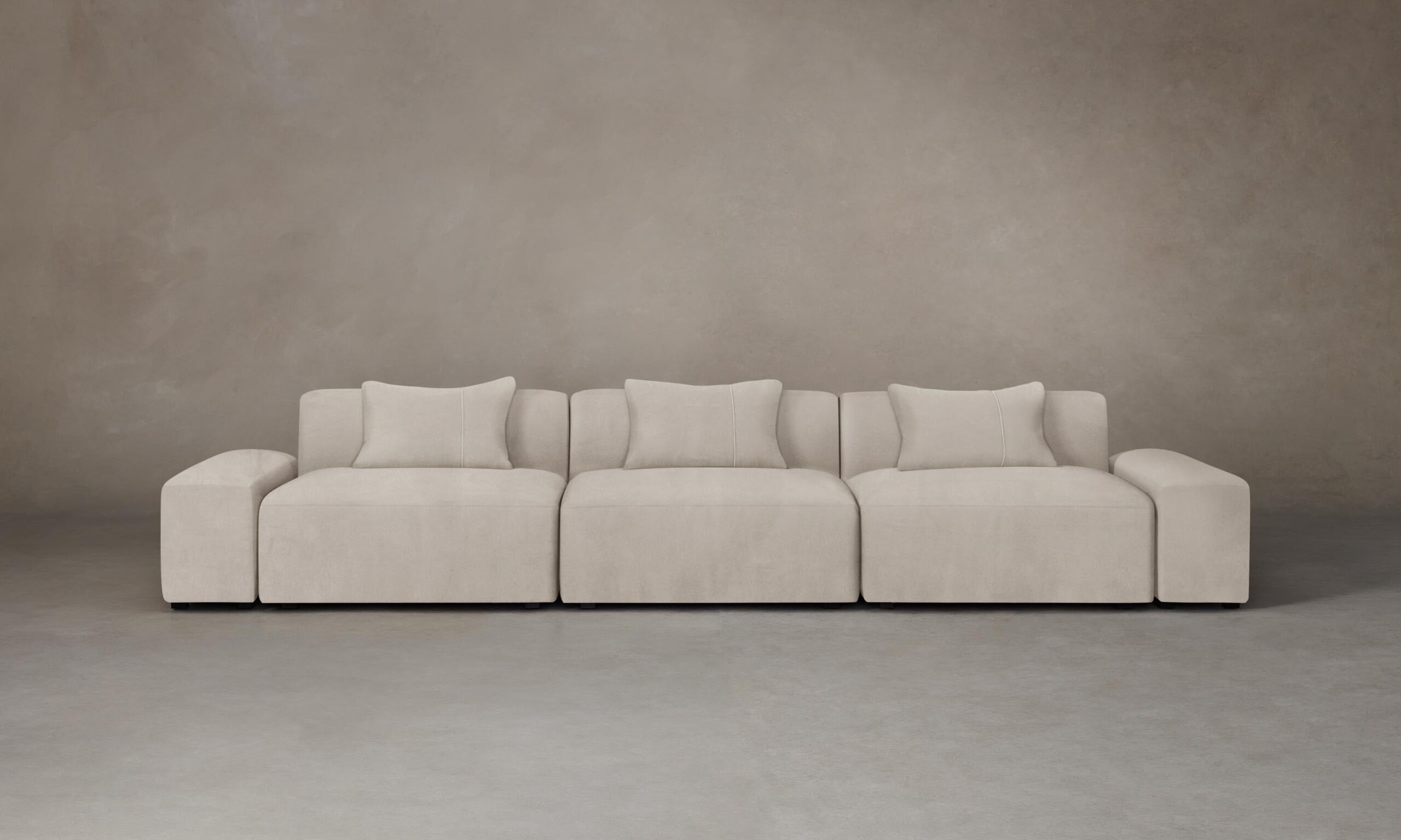 The Breuer modular sofa draws inspiration from the bold and graphic shapes of brutalist design. Tightly upholstered for a sleek look, it has a low-lying seat accompanied by plush throw pillows.