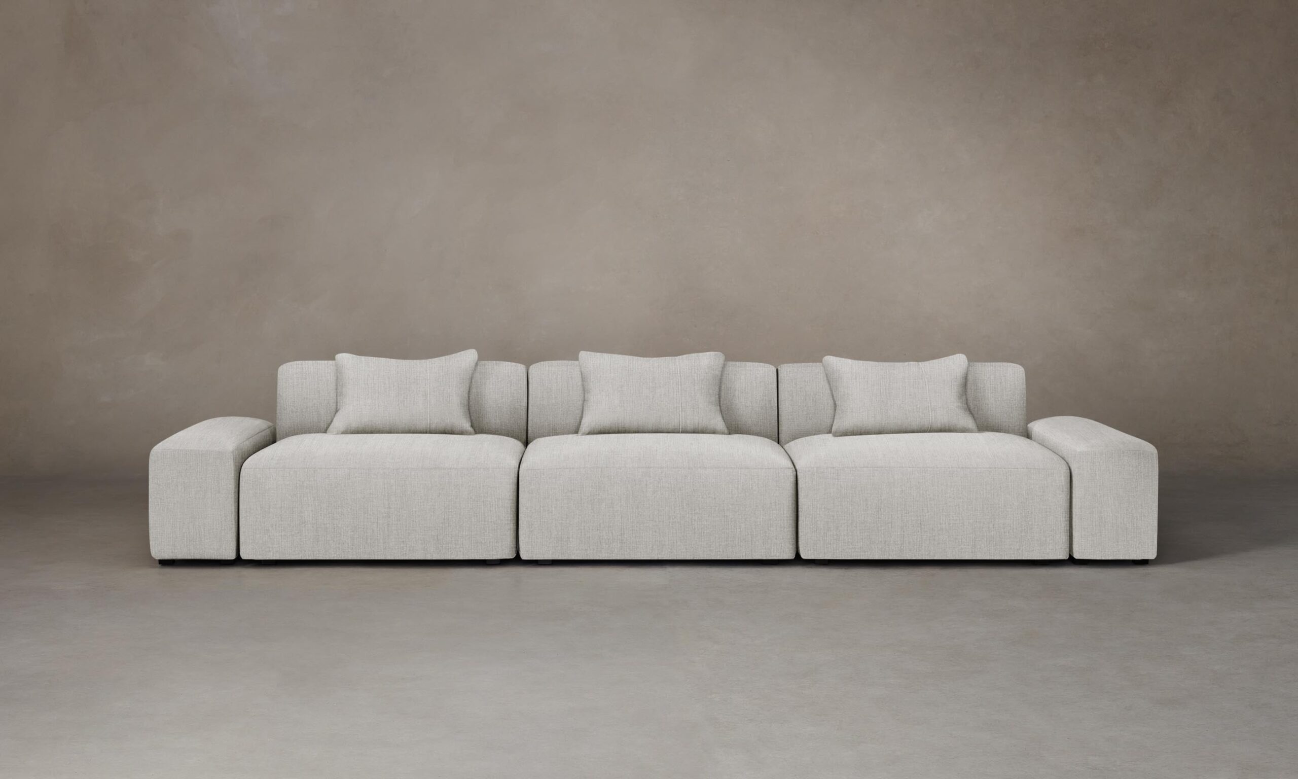 The Breuer modular sofa draws inspiration from the bold and graphic shapes of brutalist design. Tightly upholstered for a sleek look, it has a low-lying seat accompanied by plush throw pillows.