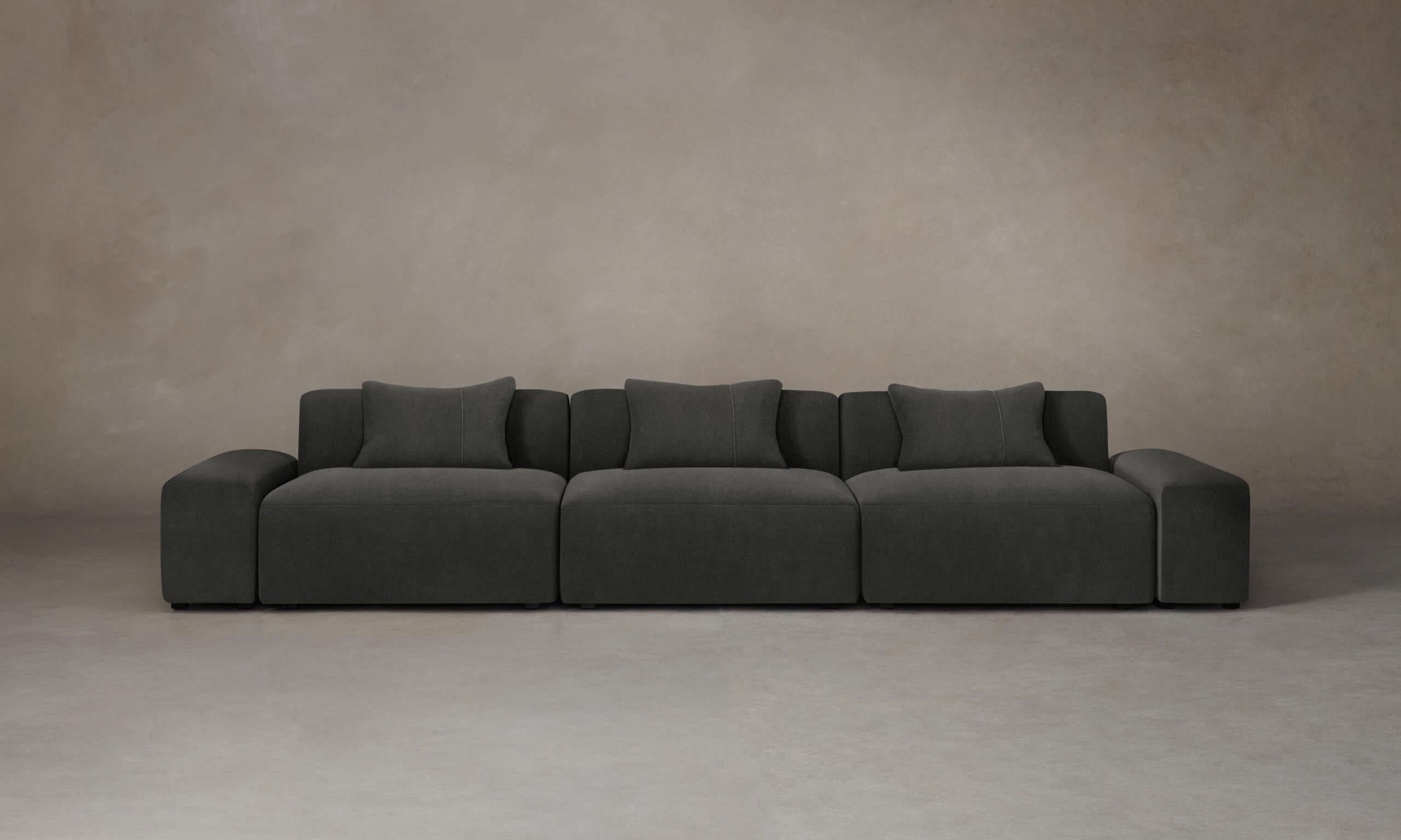 The Breuer modular sofa draws inspiration from the bold and graphic shapes of brutalist design. Tightly upholstered for a sleek look, it has a low-lying seat accompanied by plush throw pillows.