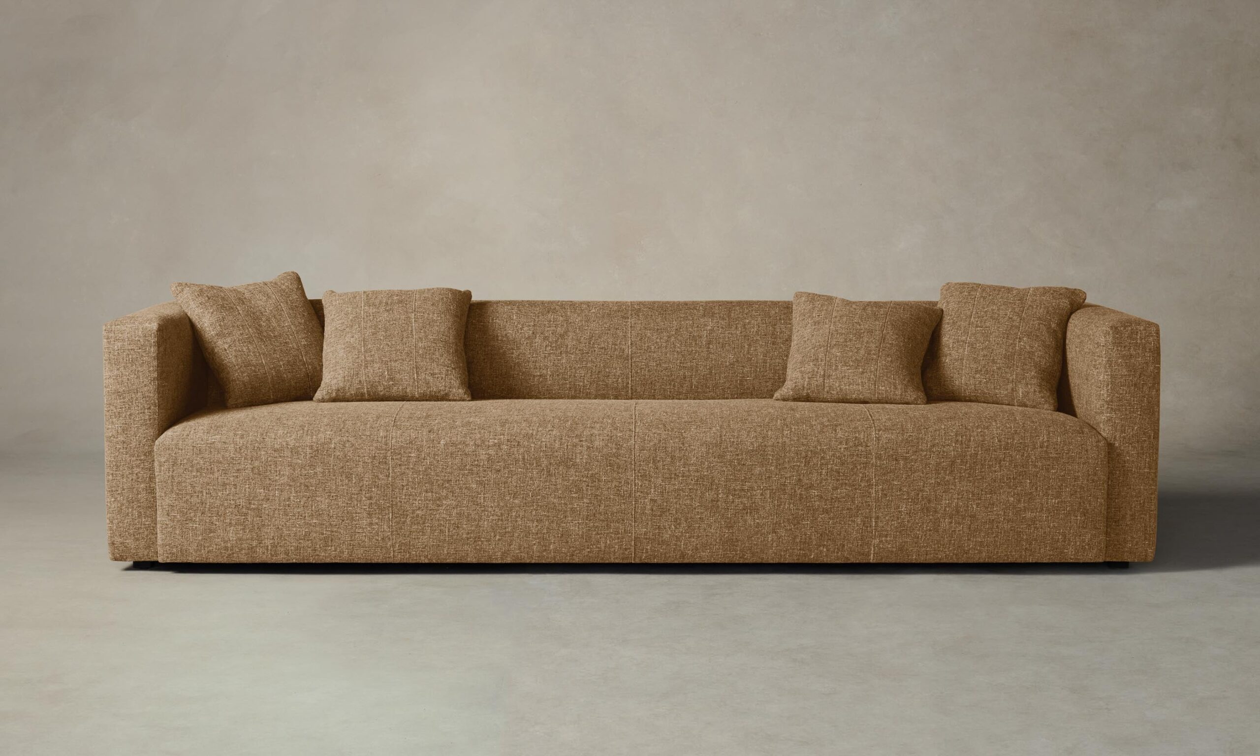 The Breuer sofa draws inspiration from the bold and graphic shapes of brutalist design. Tightly upholstered for a sleek look, it has a low-lying seat accompanied by plush throw pillows.