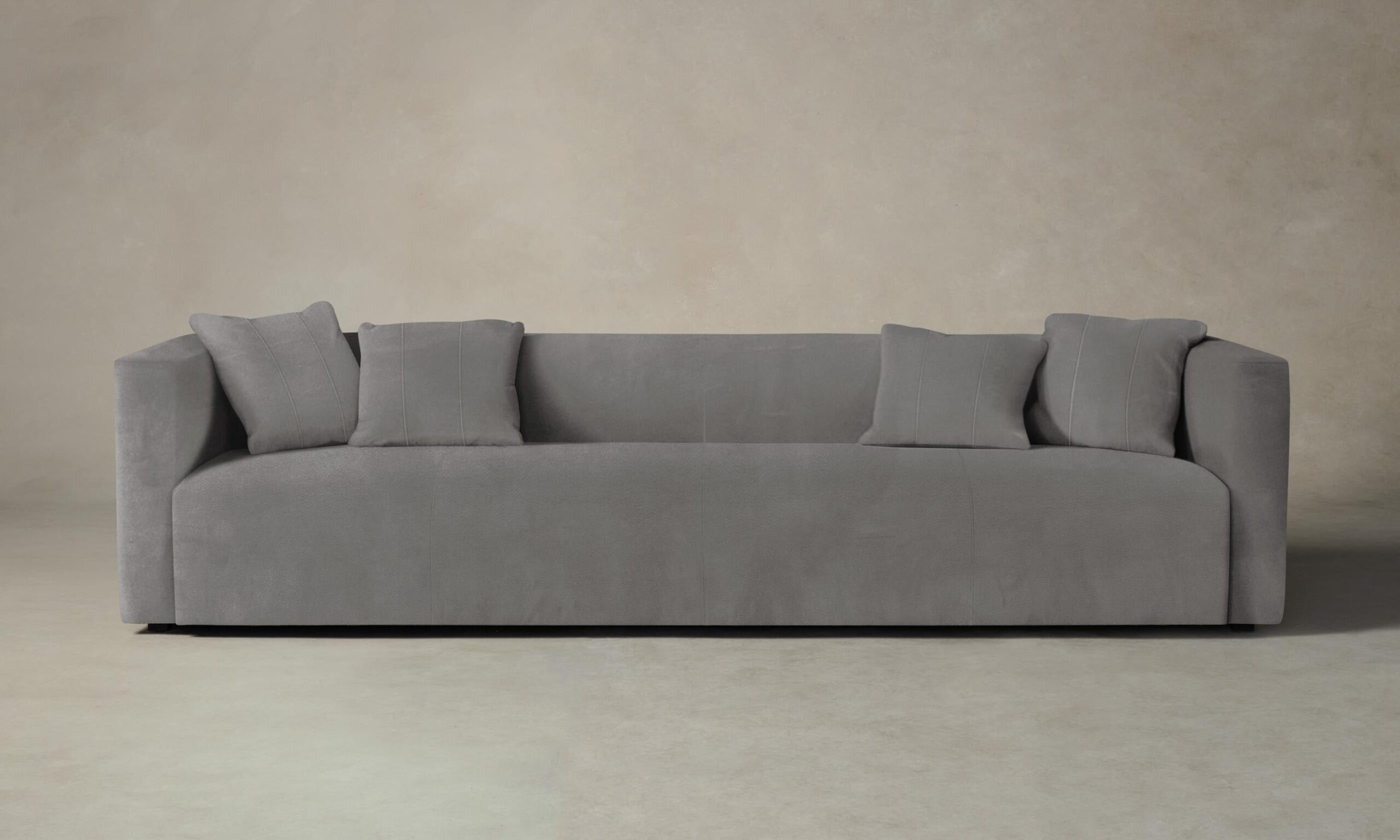 The Breuer sofa draws inspiration from the bold and graphic shapes of brutalist design. Tightly upholstered for a sleek look, it has a low-lying seat accompanied by plush throw pillows.