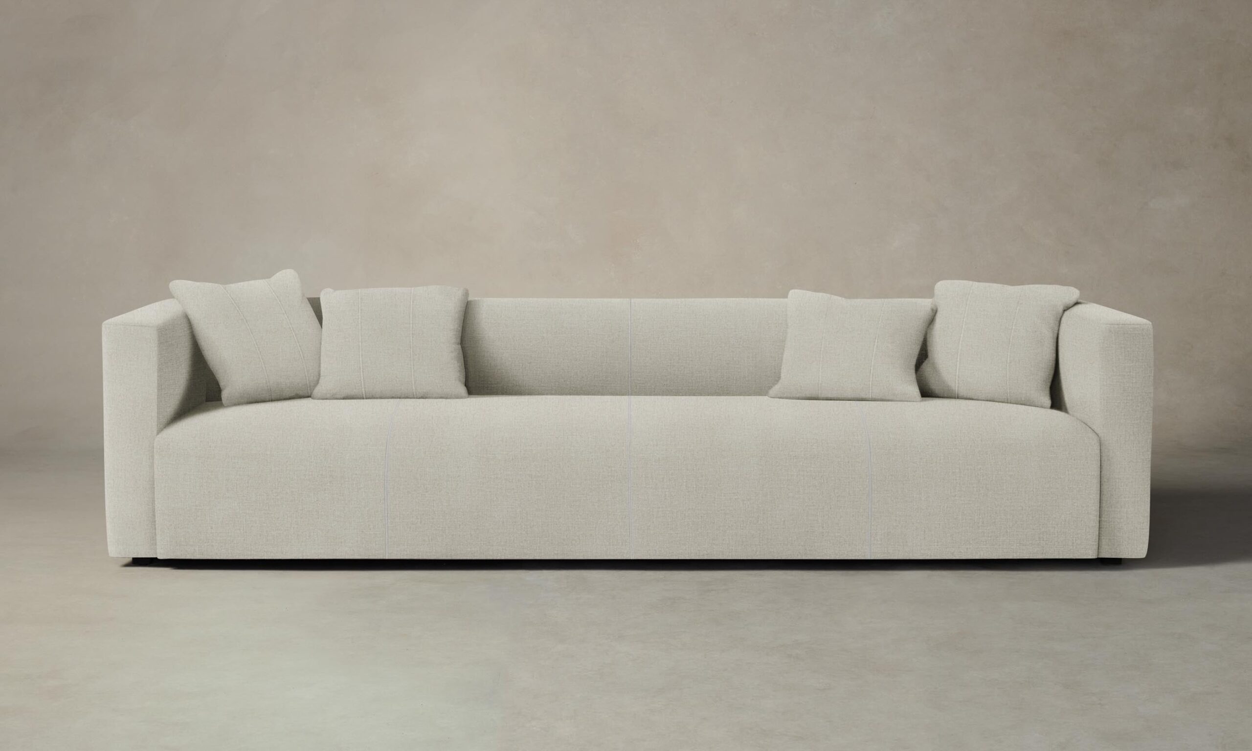 The Breuer sofa draws inspiration from the bold and graphic shapes of brutalist design. Tightly upholstered for a sleek look, it has a low-lying seat accompanied by plush throw pillows.