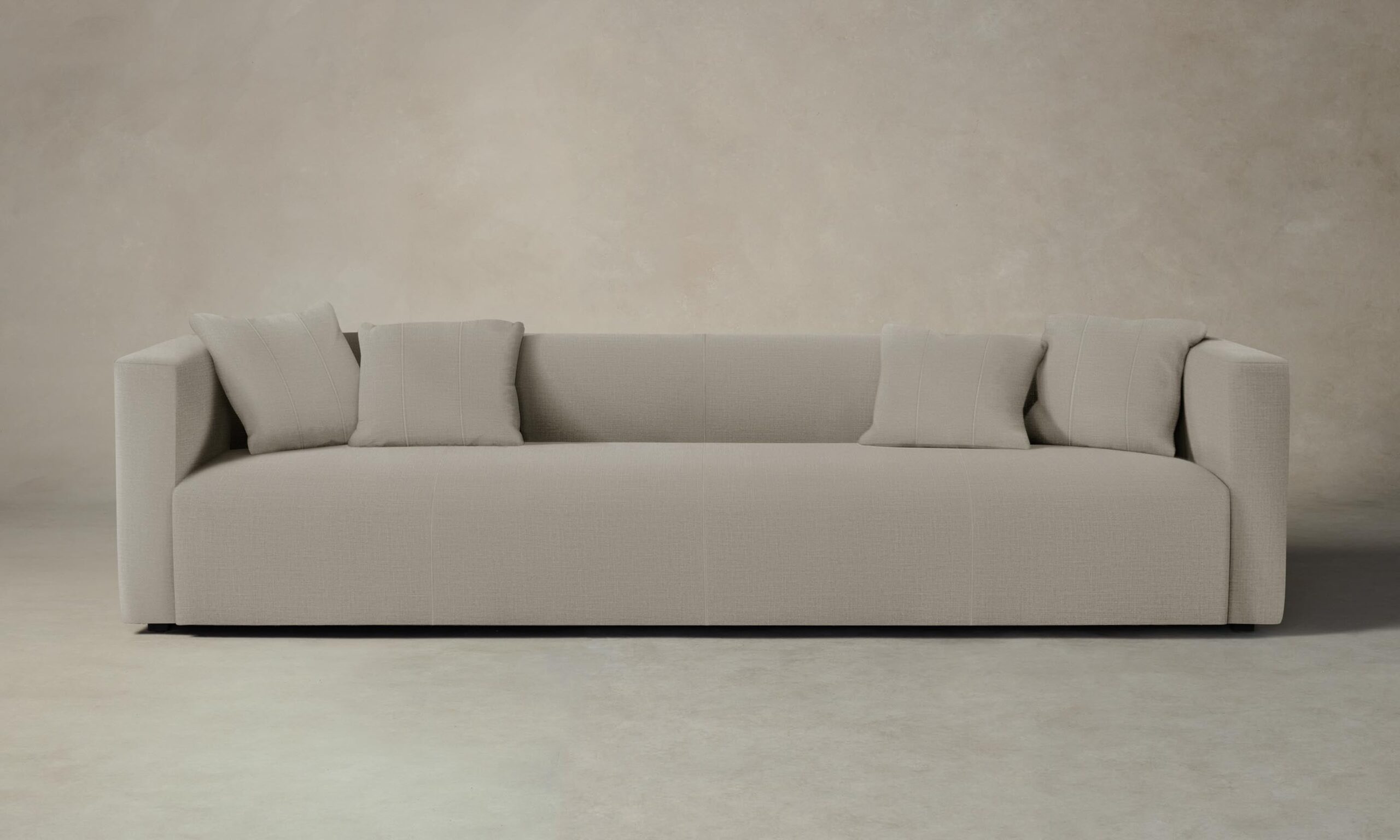 The Breuer sofa draws inspiration from the bold and graphic shapes of brutalist design. Tightly upholstered for a sleek look, it has a low-lying seat accompanied by plush throw pillows.